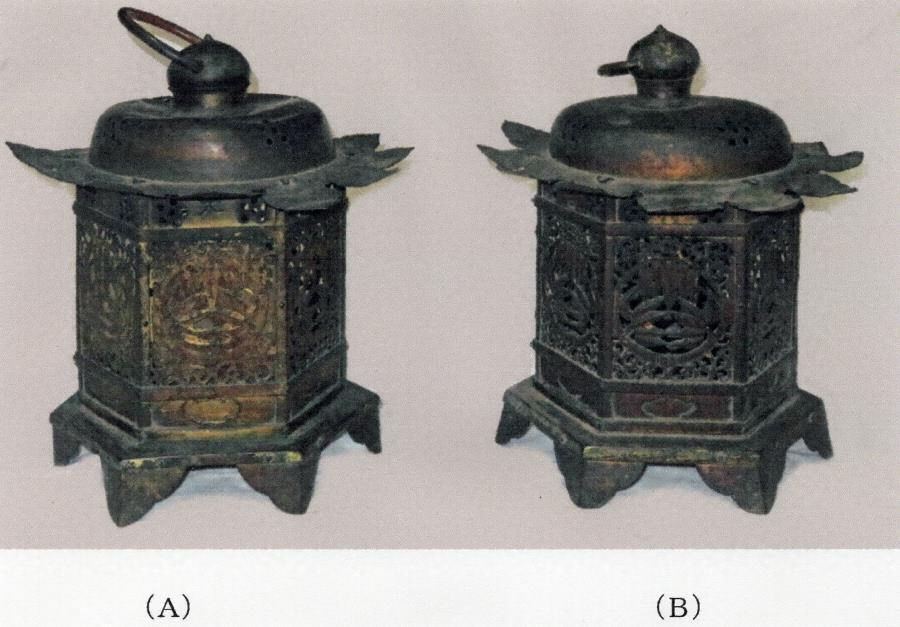 本品は、銅、鍛造、鍍金で、六角形の釣灯籠2基である。笠は宝珠をいただき、上面を水平気味に作る甲盛をもたせる。五曜形の煙出しを四方に透かす。吹返しは一枚板で作る十二弁花先形になり、下面は素文で、根元には猪の目形を透かす。