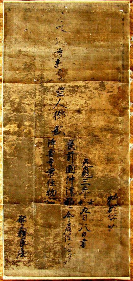 裏書より、元亀3年(1572)に浄喜寺第三世住職良慶が願主となって常住物として調えたものであることがわかる。本願寺第十一世顕如の名と花押も見える。