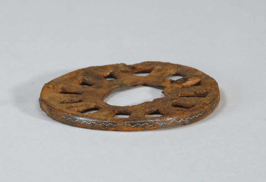 やや大振りな倒卵形の十二窓鍔である。外側部に、銀象嵌で文様を施す。文様は、連続した波状文で、部分的に波状文を挟む直線文が残る。鉄製鍔は、古墳時代後期に出現し、盛行した。以後、近世の日本刀にまで引き継がれる日本列島独自の刀装具である。