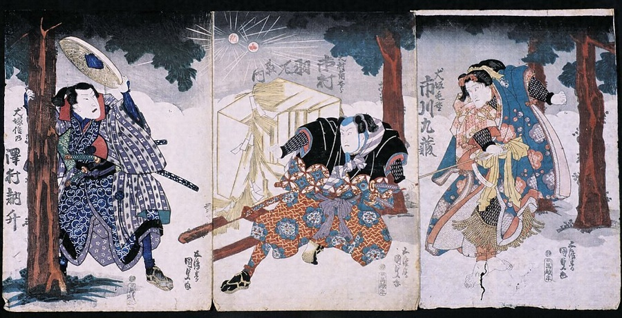 役者絵。江戸市村座上演のもの。脚色した場面で、毛野(市川九蔵)・信乃(沢村訥升) ・大角(市村羽左衛門)を描く。