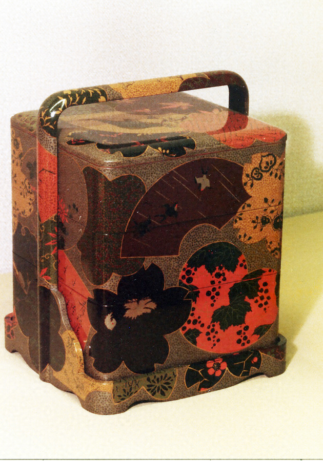 手提盆付の隅丸の三段手提重。図柄の中に「青森県陸奥の国中津軽郡弘前本町五丁目漆器樹産会社」の文字が研ぎ出されている。漆器樹産会社は明治13年の設立なので、それ以後の作である。ななこ塗の地に、扇面、雪輪などの窓を置き、その中に鳥や草花などの図柄を配置している。