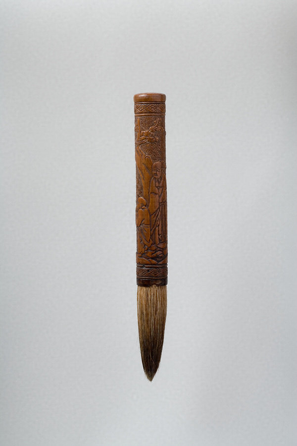林和靖(九六八~一〇二八)は、北宋時代の代表的な詩人。清らかな趣に富む彼の詩が人々に愛されたこと、俗世を避けて梅と鶴を愛した仙人のような生活が憧れの対象となったことなどから、理想的な文人として彼を主題とした絵画や工芸作品は数多く、本筆もその一つである。表皮を取り去った竹に、梅の老木と悠々と空を舞う鶴、穏やかに微笑む林和靖を浮き彫りで表現しており、地の文様には精緻な亀甲繋ぎが表され、装飾性が高められている。