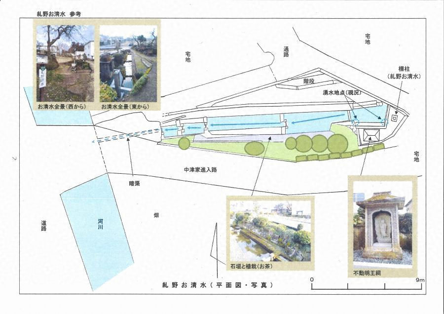 現在、地元では糺野お清水と呼ばれている。かつては「おしょっさん」と呼ばれ親しまれていた。鯖江台地西側崖面裾に位置し、現在も湧水がみられる。もともと湧水池付近は笏谷石によって護岸が整備されていたようであるが、これまでの補修によって多くがコンクリート製護岸に置き換わり、笏谷石はわずかに見られる程度である。大きく5つに区画され、湧水のみられる最も東側の区画から西側にかけて①湧水部、②飲料水用、③野菜洗い用、④洗濯用、⑤おむつ洗い用というように用途別に利用されていたという。水が流れるこの区画の南側壁面には石垣が数段積まれ、さらにその上にはお茶の木が植栽されている。また、湧水区画の東側には笏谷石製の不動明王像が祀られている(銘文等は確認されず)。現在のお清水は、西縦貫線から杉本町方面を結ぶ道路(この道は畦道程度であったとのこと)から入る構造となっているが、昔は水落の北陸道から分岐して吉江を結ぶ旧道から入る道があったらしい。昭和初期までは村に暮らす様々な人たちが情報を交換する社交場であったということであるが、上水道の普及とともに利用する人は途絶えたという。また、台地上の開発によって森林が消えて以降、湧水量も少なくなったということである。