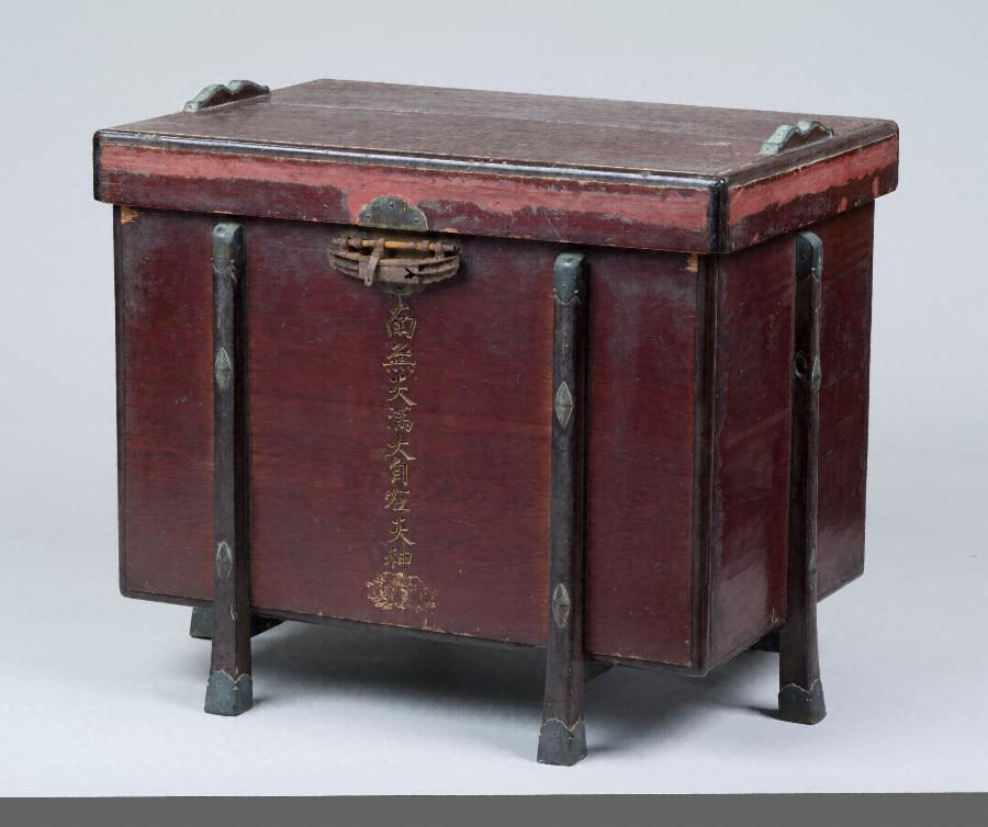 唐櫃は、本資料群を一括収納してきた大形の六脚唐櫃で、天神名号ほかの道具類を懸子に収めて上段とし、下段に机を収め、制作時期は机とともに室町時代前期にまで遡りうる。