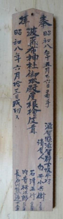 本殿は高島市が行った調査により確認された棟札から、江戸時代初期の元和10 年(1624)に建立されたことがわかる。建立後は、正保3年(1646)に修理、延享4年(1747)と明和3年(1766)、寛政元年(1789)、昭和8年(1933)に屋根の葺き替えを行った記録がある。