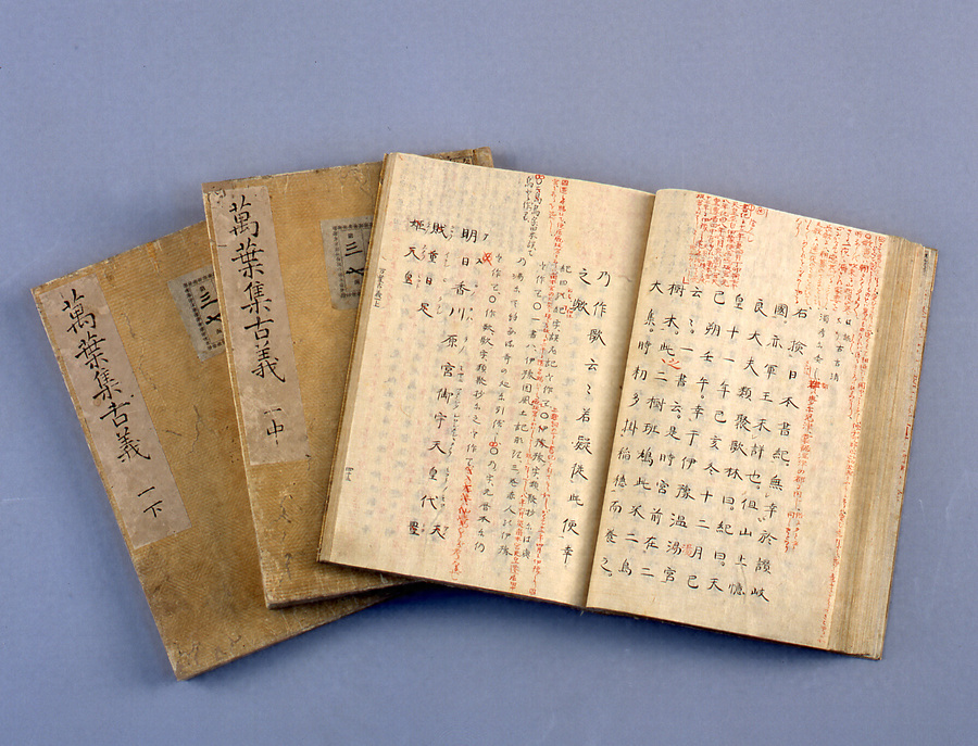 幕末の国学者・土佐藩士(用人・白札/藩校教授館下役)鹿持雅澄による注釈書。全22巻。第1~第10巻まで22分冊となり、内9巻は欠。第2巻上下は2部ずつある。巻2の107丁に「戊寅八月六日書写畢」とあって、この年1818(文政元)年が、おおむね『万葉集古義』の起稿の年とされている。その後研究の進むにつれ稿本にはつぎつぎに書入れが行われ、鹿持雅澄(1791~1858)の死の前年の1857(安政4)年1月まで続けられたといわれる。したがって本書の成立は約40年の歳月を要している。もっとも本書は全20巻の『万葉集古義』の前半の部であって、飛鳥井本とこの山内文庫本とを合わせて『万葉集古義』稿本の本来のものとなるが、飛鳥井本が関東震災で亡失した現在、雅澄の業績をじかに伝える文書の価値は大きい。『万葉集古義』は明治になって宮内省より木版で刊行され、以後活版も度々出版となり、『万葉集』の註釈書としてよく知られている。〈高知市文化財情報を元に一部改訂〉