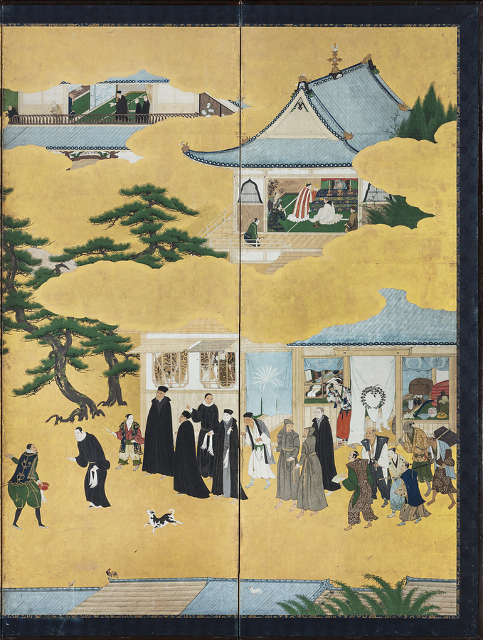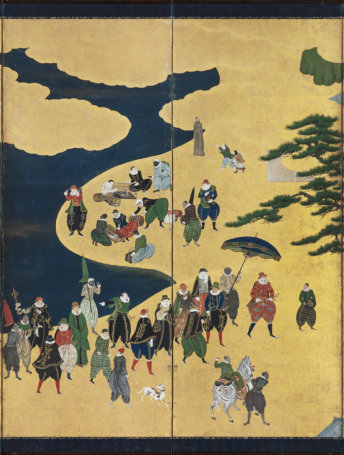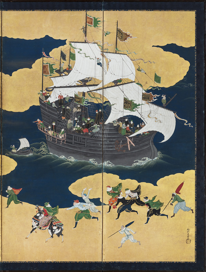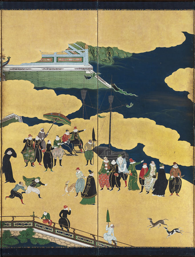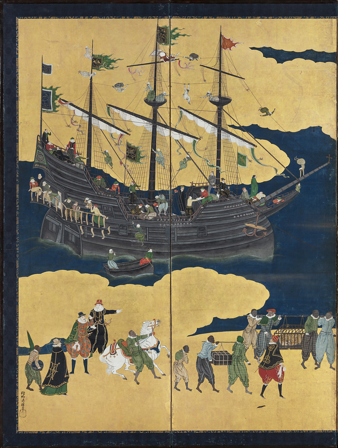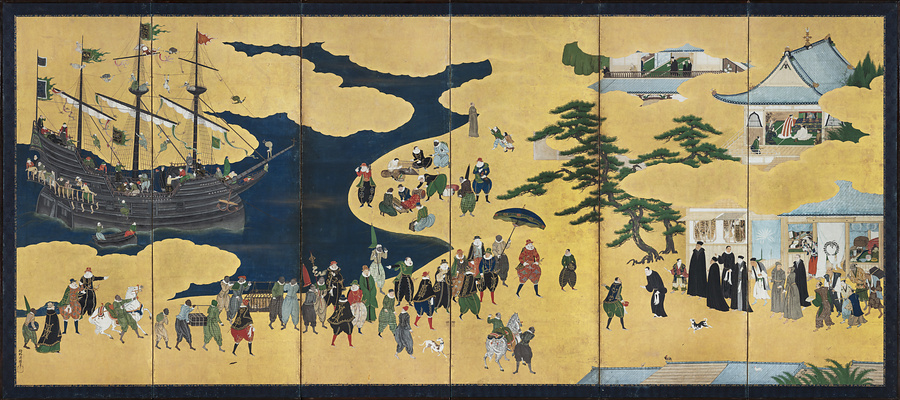スペイン、ポルトガルとの交易の様子を描いた南蛮屏風は16世紀末期から17世紀半ばを中心に制作され、90件以上が確認されています。なかでも、当館が所蔵する狩野内膳(1570~1616)の作品は、緻密な描写と鮮やかな色彩から南蛮屏風の代表的作品として広く知られています。
