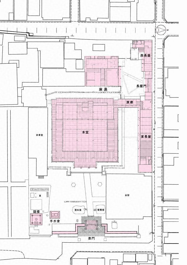 本堂 桁行33.68m、梁行32.20m/庫裏 桁行15.92m、梁行13.94m/長屋門 桁行14.20m、梁行3.63m/西長屋 東西棟:桁行15.77m、梁行13.07m 南北棟:桁行5.91m、梁行3.94m/東長屋 桁行30.94m、梁行5.88m、下屋0.96m/渡廊 桁行11.27m、梁行3.05m/表門及び脇築地塀 表門:間口5.67m 築地塀:総延長40.5m/鐘楼 桁行3.66m、梁行3.85m/手水舎 桁行3.49m、梁行2.24m