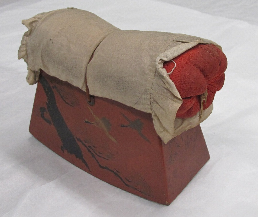 木台に松と2羽の鶴の図が蒔絵で描かれており、その上に括枕(筒状の布にそば殻などを詰めたもの)が取り付けられてある。