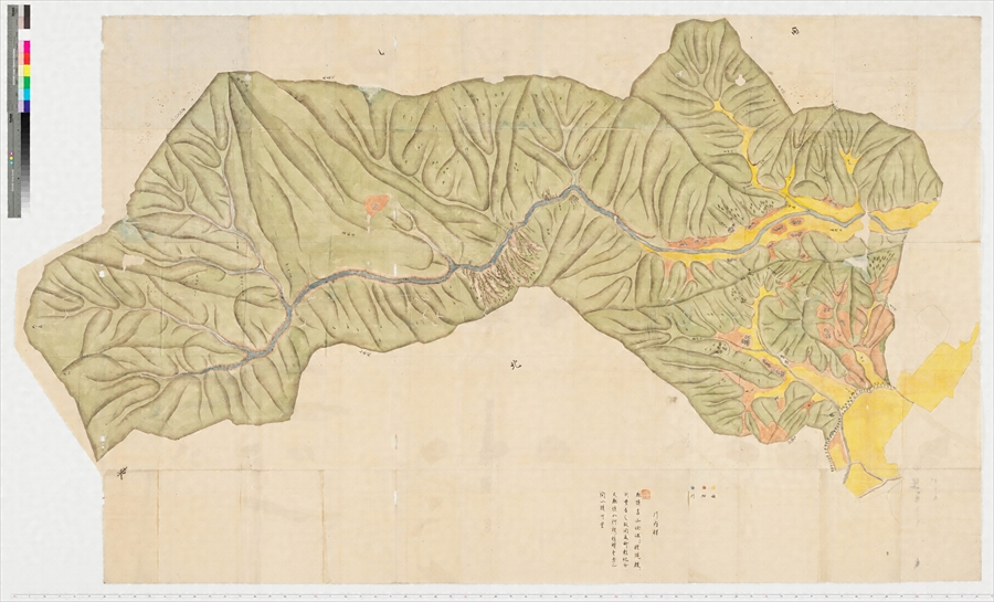 宇和島藩が、宇和島城下の南、川内村(愛媛県宇和島市)を測量して作製した絵図。下側の余白には、村境に高くて険しい山が多い川内村では測量が困難であったことや、1分1間の縮尺(約1800分の1)で絵図が作製されていることが記されている、鬼が城山と権現山を源流とする薬師谷川が村の中央を流れる。東側にはその薬師谷川がつくりだした渓谷が見え、瀧平・遠ケ淵・碁盤石・石神と名前が記された特徴的な岩が描かれている。村の北西をかすめて通る道は宿毛街道。この先の寄松村(愛媛県宇和島市)では、宇和島に向けて道の両側に松並木が整備されたことがいわれているが、本図からは松並木が川内村から続いていたことがわかる。