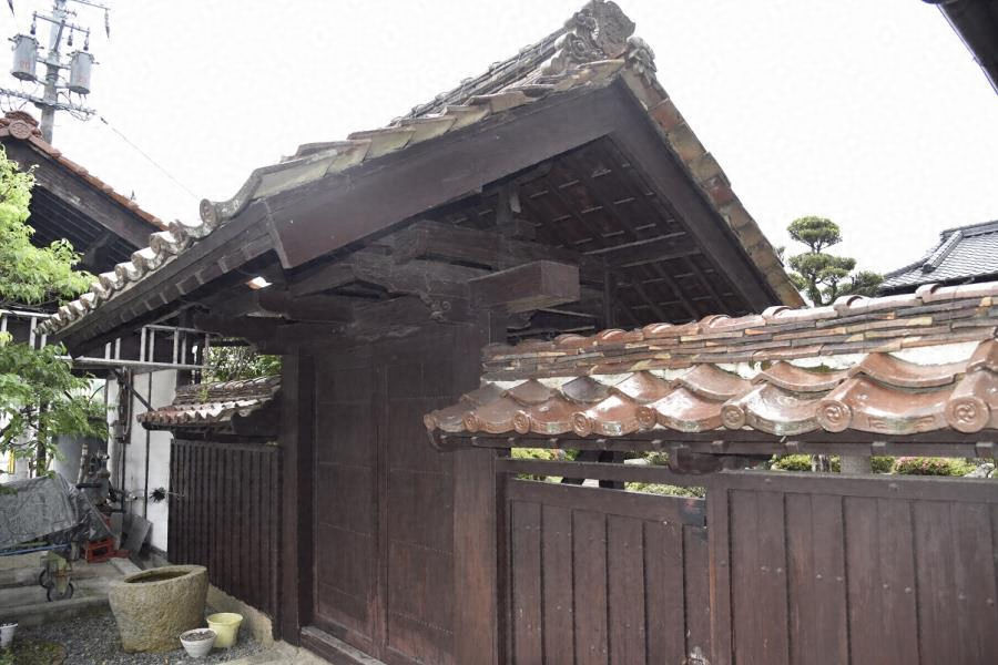 敷地の南東に位置し、主屋から東に延びる。全長7・6メートルで、中央に一間薬医門を置く。門は本柱に五平の冠木を載せ、二重梁で切妻造桟瓦葺の屋根を受ける。両側の塀は柱から腕木を出して桁を受け、桟瓦葺の屋根を載せる。庭を仕切り、表構えを構成する。