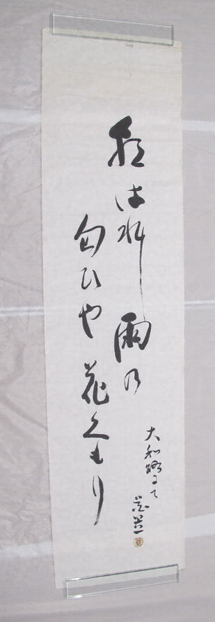 墨で大きく「朝はれし雨の/匂ひや花くもり」と書かれ、画面右下に「大和路にて/花笠」という落款があり、その下に印章(朱文円印[花笠])が捺されている。
