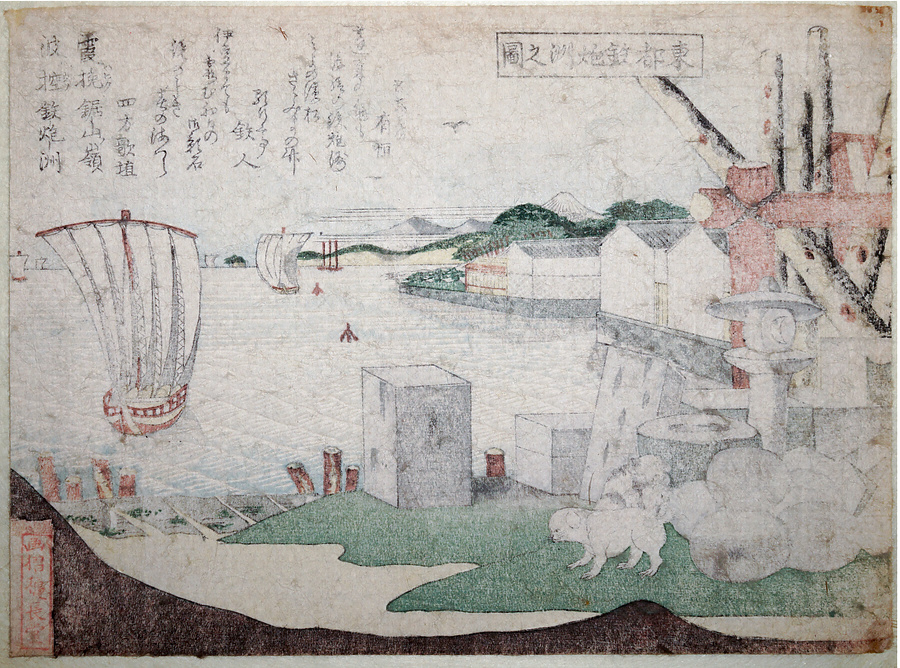 司馬江漢の「鉄砲洲富士遠望図」(個人蔵)の図様と類似した摺物。同主題の司馬江漢による有風風景画が芝神明宮に奉納されていたことが知られており、この摺物も神明宮に掲げられた奉納額の評判にあやかり制作されたと考えられます。