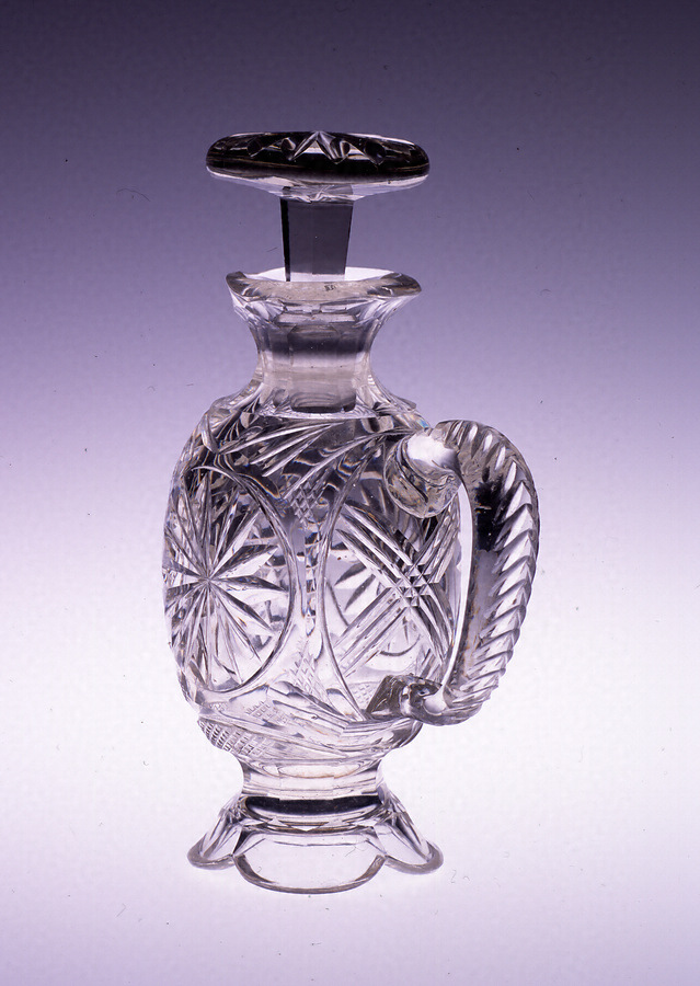手彫り切子円形パネルに剣菊文手付きガラス水差