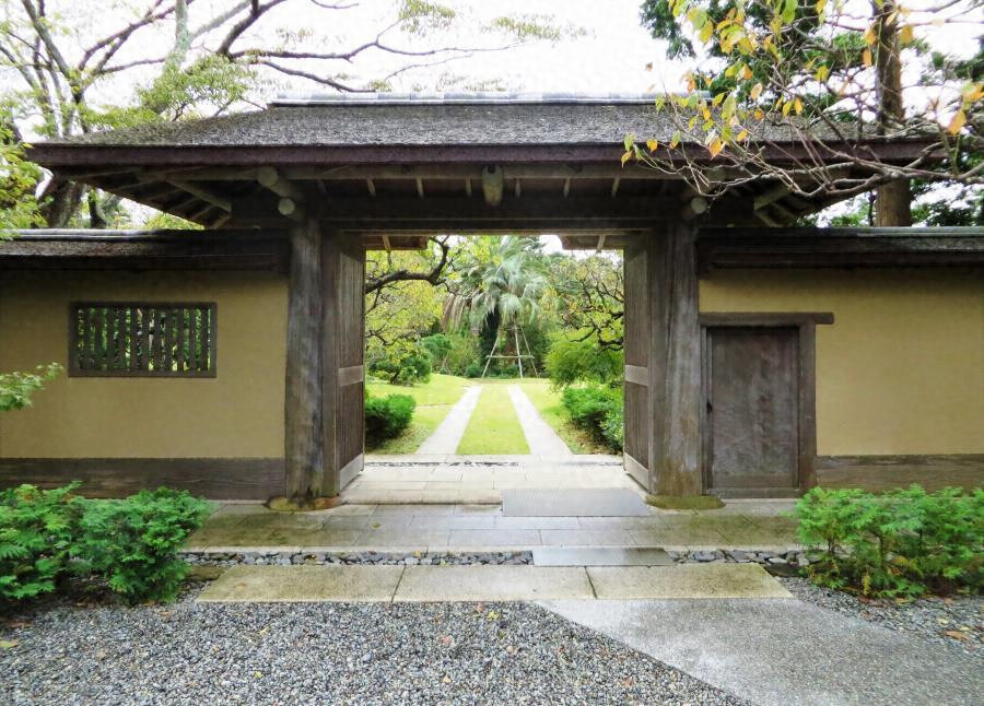 前庭と内庭を画し、北面して建つ寄棟造檜皮葺の門。間口三・三メートルで本柱を立て、背後に控柱、左右に袖塀を付す。本柱や棟木、垂木等に丸太材を用い、背面の屋根を葺下ろして軒先中央を半円形に切欠く。裏千家今日庵の兜門に倣った上質な数寄屋建築。