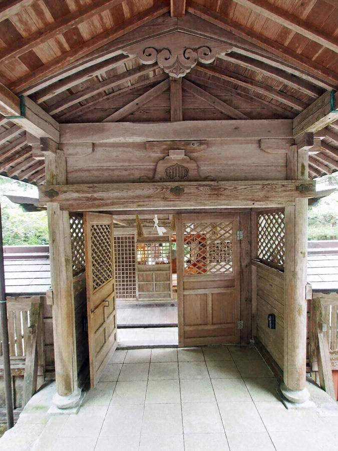 本殿を囲む透塀の正面中央に建つ切妻造銅板葺妻入の門。間口二・四メートル、礎盤上の4本の丸柱を貫と長押で固め、中備蟇股、舟肘木で梁桁を受け、格天井を張る。妻飾は豕叉首、軒は一軒で起り屋根とする。明治時代の「制限図式」の影響がみられる神社建築。
