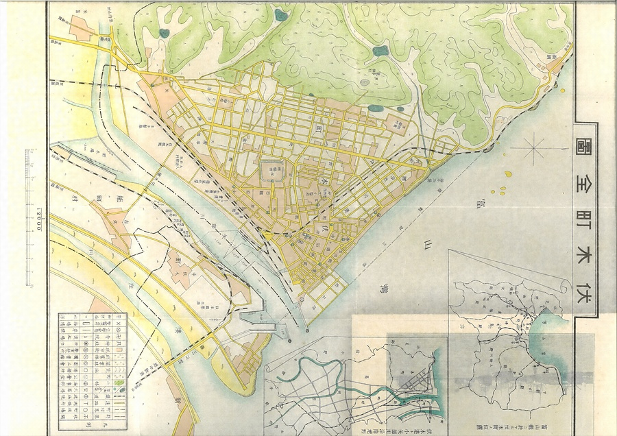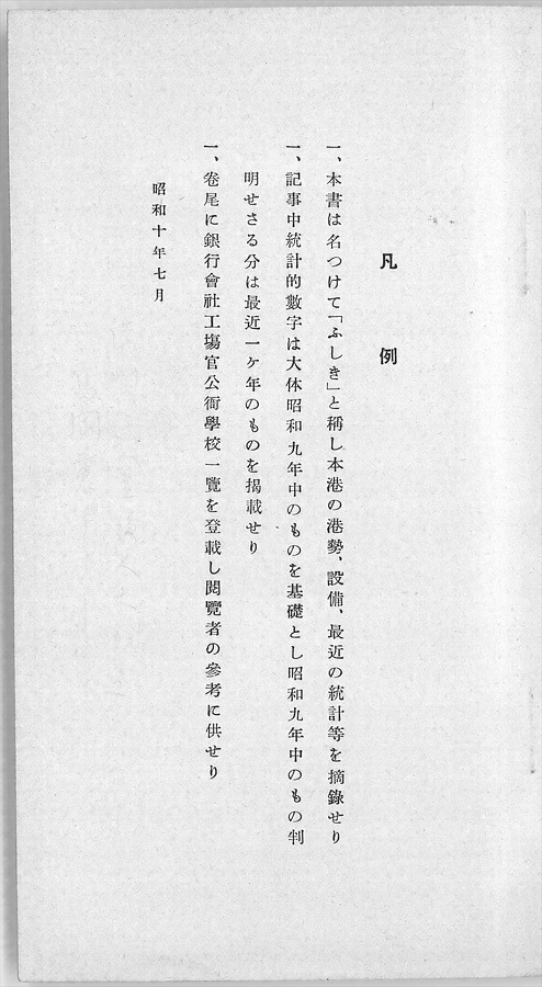 色刷の「伏木町全図」(「船舶出入主要品ノ仕向出港別一覧」)が添付しており、伏木町の港湾設備の実態及び町勢などの統計数値が記されている。