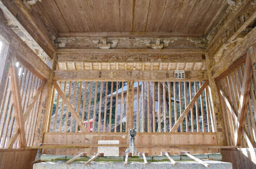 神楽堂の東側に並んで建つ。切妻造桟瓦葺の起り屋根、吹放しの長方形平面で、鏡天井を張り、中央に手水石を据える。内転びの角柱を内法虹梁と頭貫で固め、台輪を廻す。組物は平三斗、一軒疎垂木とする。丁寧なつくりで、半僧坊前の景観を格調高く整える。