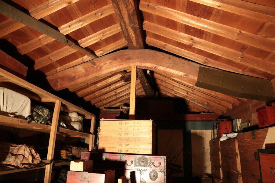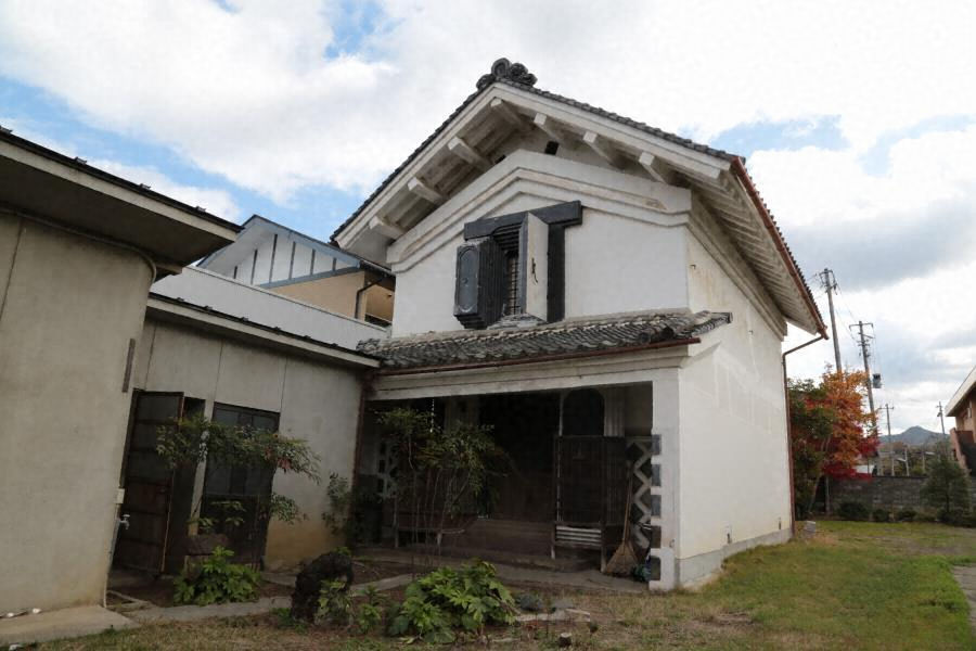 主屋の東背面に建つ土蔵造二階建の蔵。東西棟の切妻造、桟瓦葺とし、西正面に下屋を付す。外壁は漆喰塗で鉢巻を二段に廻らし、垂木まで塗込めた丁寧なつくり。2階西面開口部廻りを黒漆喰塗として全体を引締める。地方有力者の屋敷地の構えを引き立てる。