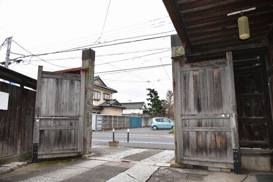 店舗東側に建つ資材搬入に用いた門。木製、高さ3・6メートル、方形の木製門柱一対を間口3・1メートルで立て、木製の両開戸を備える。門柱両脇に延びる袖塀は、基礎を花崗岩の延石、屋根を金属板葺とした板塀。店舗と調和した街路景観を形成している。