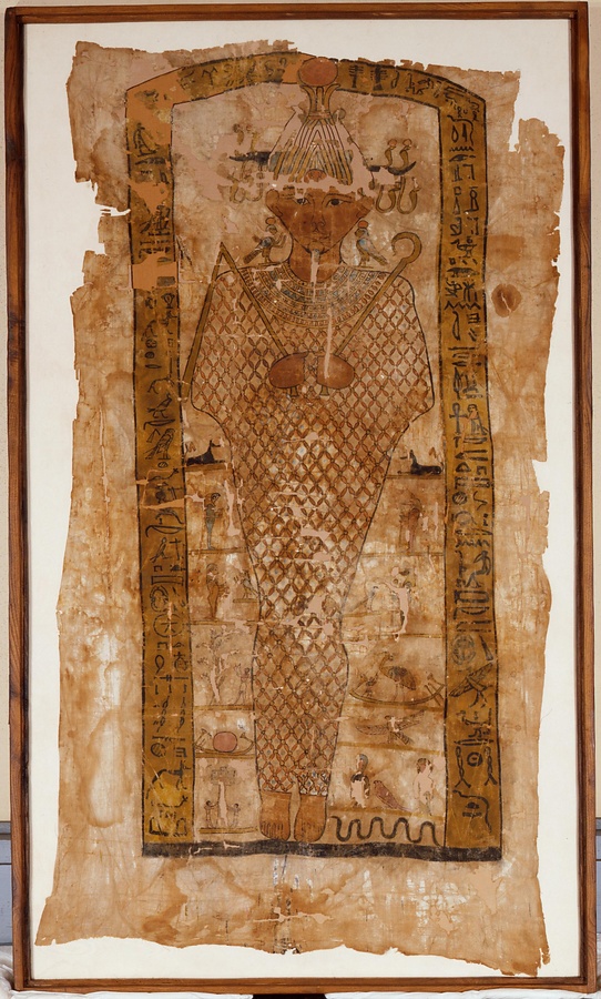 ミイラを包んでいた布です。ナオス(祠堂)を象った枠内に、死者の神オシリスの姿をした死者パディインヘルの像と死後の世界を表わした図像が描かれています。ヒエログリフ(聖刻文字)の銘文は、死者の神オシリスへの讃辞と死者の供養のための願文です。