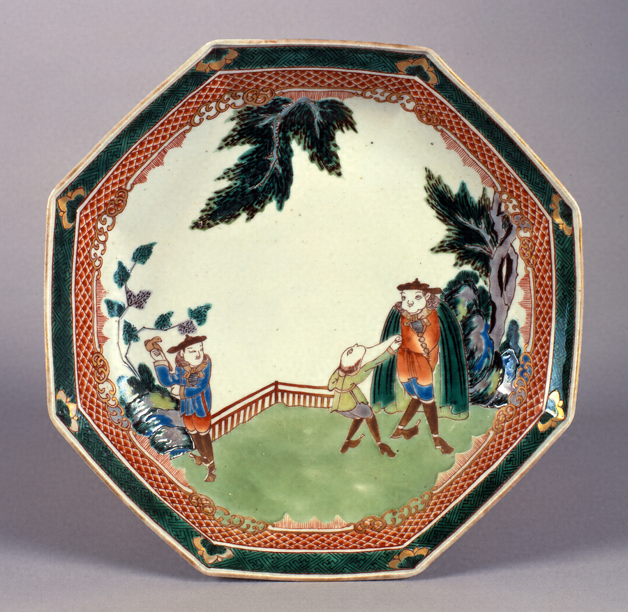 艶のあるガラス質の釉薬で、見込みにオランダ人の絵付けが施された有田製の八角皿。蓋付き碗のセットと同様に欄干のある場所が描かれており、画面右手に語らう2人のオランダ人、左手に手に鳥が留まるオランダ人を配しています。2人組のオランダ人は、主人と考えられるマントを羽織る人物と、巻子のような事物を手に持ち、主人にみせようとする場面が表されています。従者と考えられる人物の仰視する顔が無理な姿勢となっている点、手にする事物も線描のみで簡略化されて描かれており判然とせず、蓋付き碗に比べると絵付けの稚拙さが認められます。
