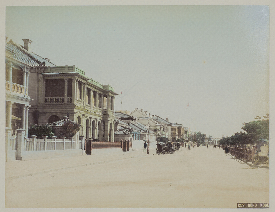 日本の風景や人物を被写体とし、人の手で美しく着色を施した金兵衛の写真は西洋人の土産として好評を博し、蒔絵表紙の豪華なアルバムに綴じこまれるなどして輸出されました。この写真は、C. B. バーナードの水彩画(「神戸海岸通り風景(The Bund Kobe)」)とほぼ同じ場所を撮影しています。