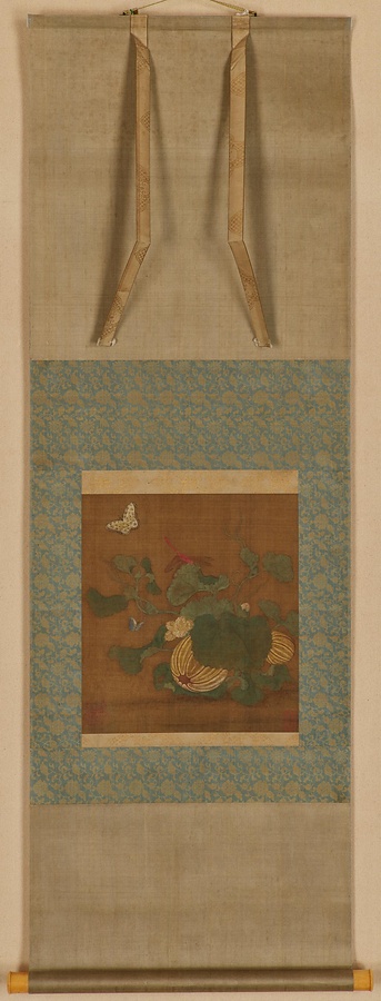 もと同じ画冊にあったものを、近年掛幅に改装したもの。瓜に蝶と蜻蛉、ハコベに蝶と蜂はいずれも子孫繁栄を意味する吉祥図像です。各図ともに「李泉」(朱文長方印)、「毘陵春峰」(朱文鼎印)の印があり、このような毘陵(びりょう)草虫画は朝鮮時代の申師任堂(しん・しにんどう、シンサイムダン)にも影響を与えました。