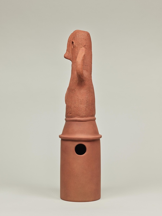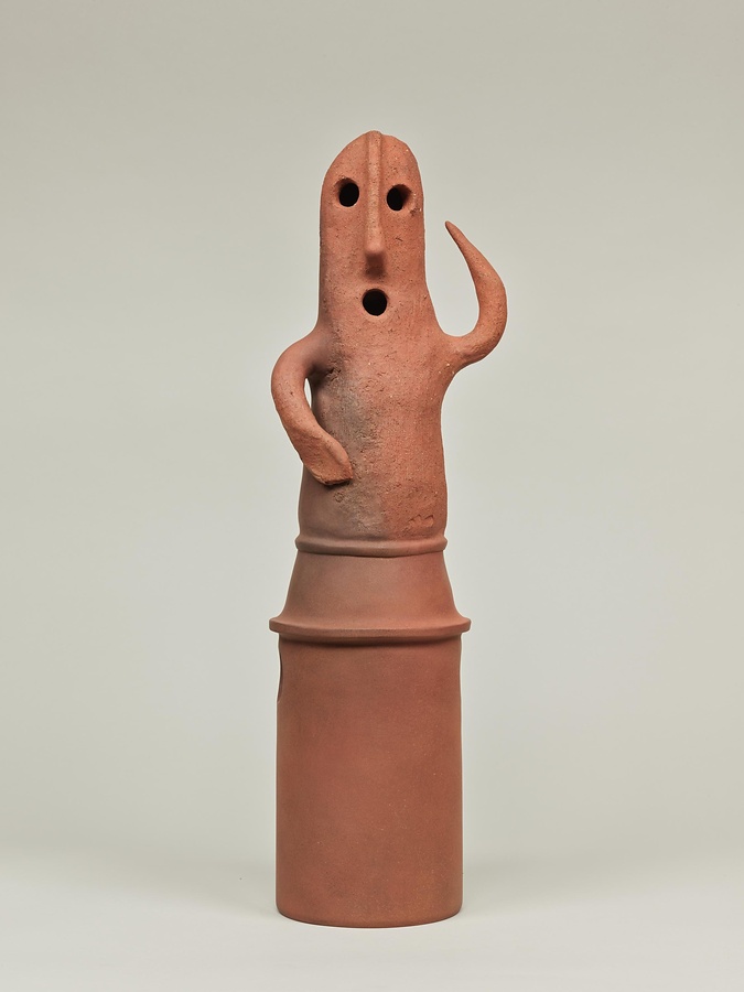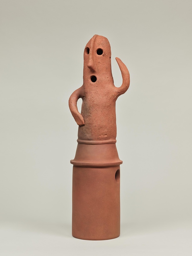 ポカンとあいた目と口の愛らしい表情と、左手をあげたポーズから「踊る人々」の愛称で知られる埴輪です。埴輪は古墳の上や裾、周堤にたてられた土で造られたやきものです。筒形の円筒埴輪を基本にして、家や道具類、武器・武具・船、のちに人物や動物などさまざまなカタチのものが加わりました。