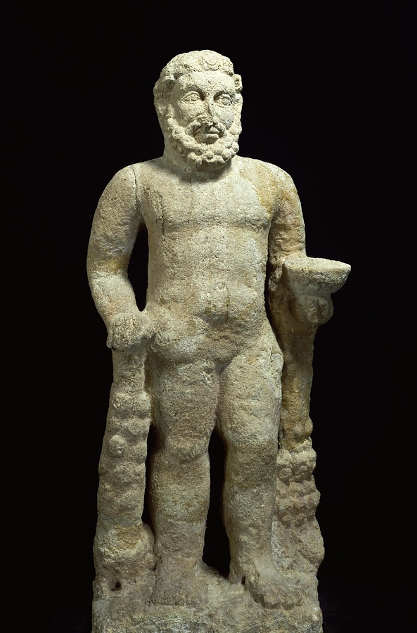 ヘラクレスはギリシア神話の英雄神です。この作品は、頭にディアデマと呼ばれる冠を巻き、右手にはこん棒を、左手には盃を持ち、腕にはライオンの毛皮をぶら下げた、典型的なヘラクレス像です。この像が出土したハトラは、現在のイラク北部に位置する城塞都市です。1世紀から3世紀にはアルサケス朝パルティア王国の支配下にあり、ローマ帝国に対する軍事的な拠点となりました。シルクロードのキャラバンが集まる都市でもあったことから、メソポタミアの伝統に加え、地中海方面やイランの美術の影響が入り混じった建築や彫像が発掘されています。ハトラで発掘された彫像の多くはイラク北部モースルの博物館に所蔵されていましたが、2015年に同地域を支配したイスラム過激派組織によって破壊されました。このヘラクレス像は、1970年に東京国立博物館とイラク政府考古総局との間で行われた資料交換によって現地から贈られたもので、ハトラの国際的な文化を語る貴重な資料となっています。