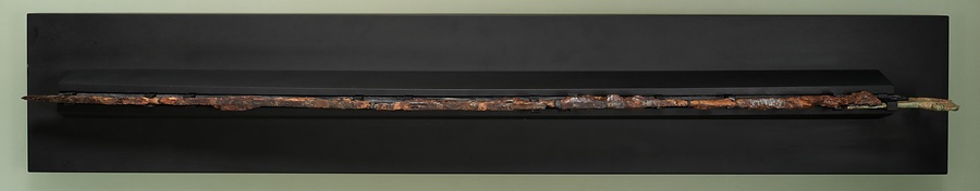 日本最古の出土銘文(めいぶん)刀剣としてよく知られ、刀身部は中国製で環頭部は日本製です。一部を欠失しますが、刀身背部に金(きん)象嵌(ぞうがん)で24文字が刻まれていたとみられます。「中(ちゅう)平(へい)」(184~189)は後漢・霊帝時代の年号で、後漢書東夷伝に倭国大乱があったとされる時期です。