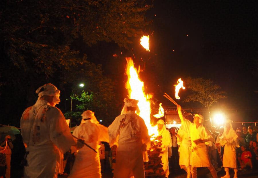 夜になると、大勢の参詣者が見守るなかで「お焚き上げ」が始まる。白装束の行者が手水で身を清めたのち、境内にある富士塚に登って「身禊祓(みそぎはらえ)」という祝詞を読み上げ、さらに仮宮に移動して「富士山御伝(おつたえ)」を読み上げる。