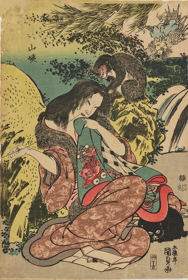 色気ある美人画で知られる国貞が描く山姥(やまんば)と怪童丸(かいどうまる)です。熊はどこでしょう。怪童丸の着物を繕(つくろ)う、色っぽい山姥の膝元で丸くなって眠っています。全身を覆う黒く短い毛並みと丸い耳と尾から熊だとわかりますが、生き物の熊像とはかけ離れたおとなしさです。(A-10569-5313と共通)