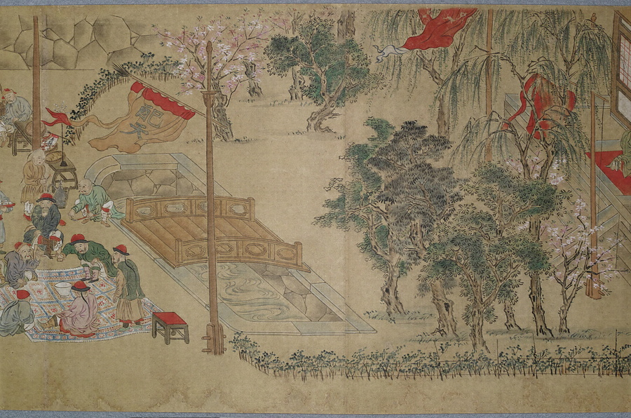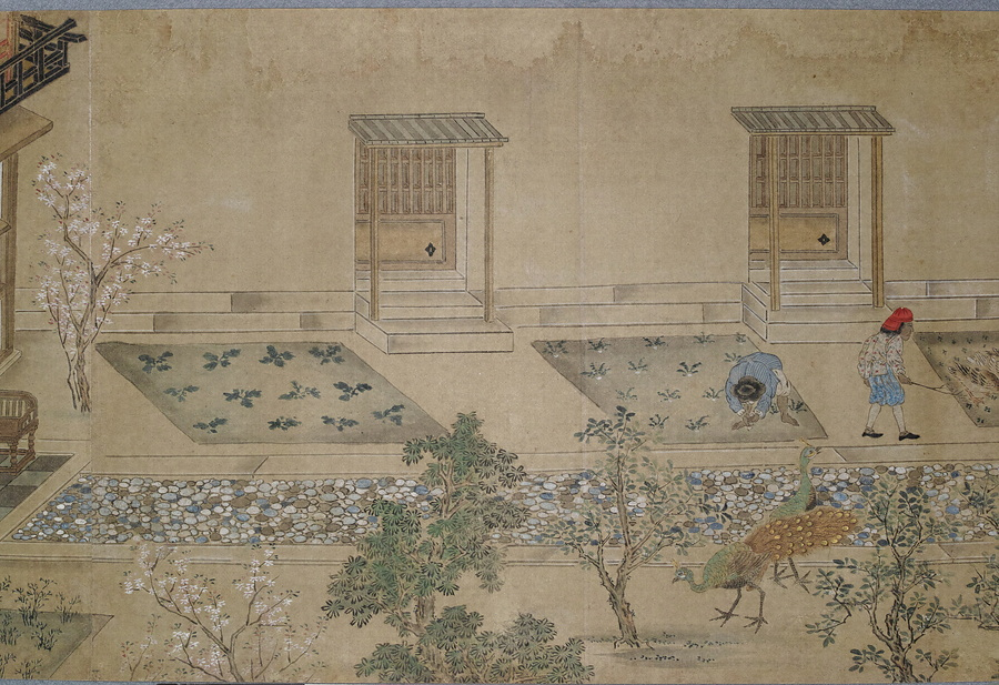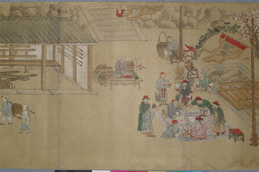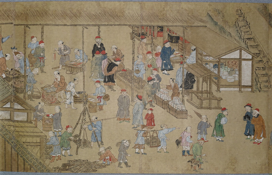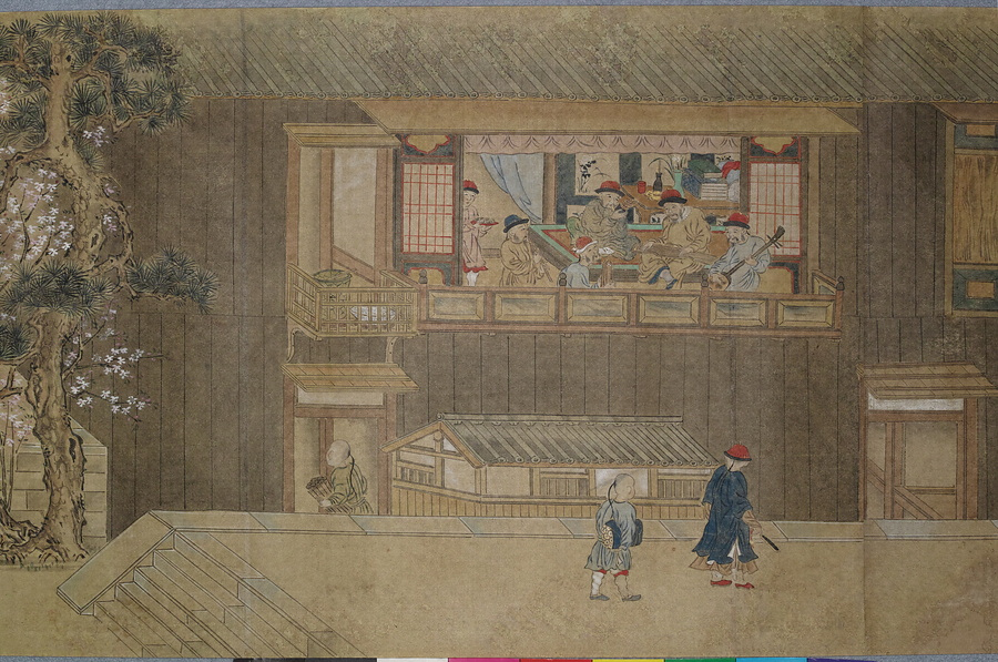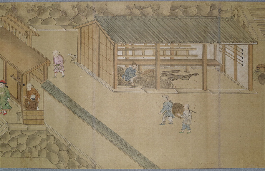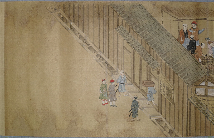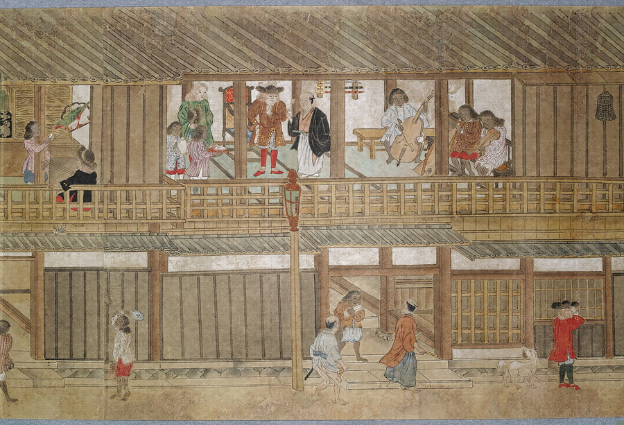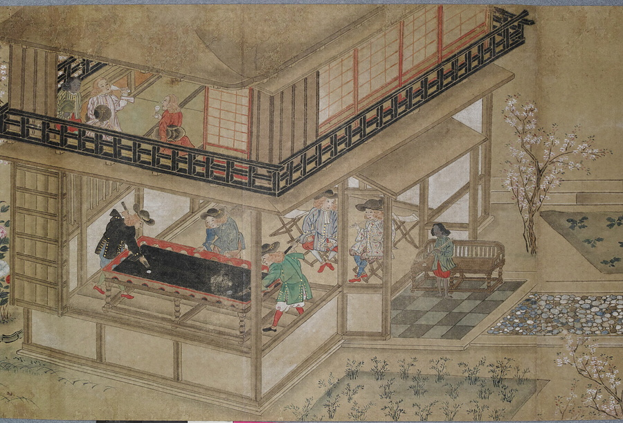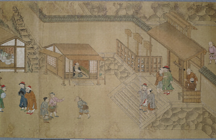 渡辺秀石(1641- 1709)は長崎出身の画家。中国浙江省出身の薬種商で、黄檗僧に転じた逸然性融(1601-68)に画を学び、元禄10年(1697)には長崎奉行から初代の唐絵目利兼御用絵師に任命されました。「鎖国」下の長崎において、オランダ人は寛永18年(1641)に平戸から出島へ商館を移転し、出島内でのみ居住・交易が許可されました。中国人ははじめ長崎の町で雑居が許されていましたが、元禄2年(1689)密貿易対策のため唐人屋敷(唐館)で居住することとなりました。元禄12年(1699)には幕府勘定頭・荻原重秀(1658-1713)が長崎を巡察し、渡辺秀石に唐人屋敷と出島の絵図制作を命じています。本図巻はこの絵図の系譜を引くもので、唐人屋敷や出島における風俗を詳細に描いています。