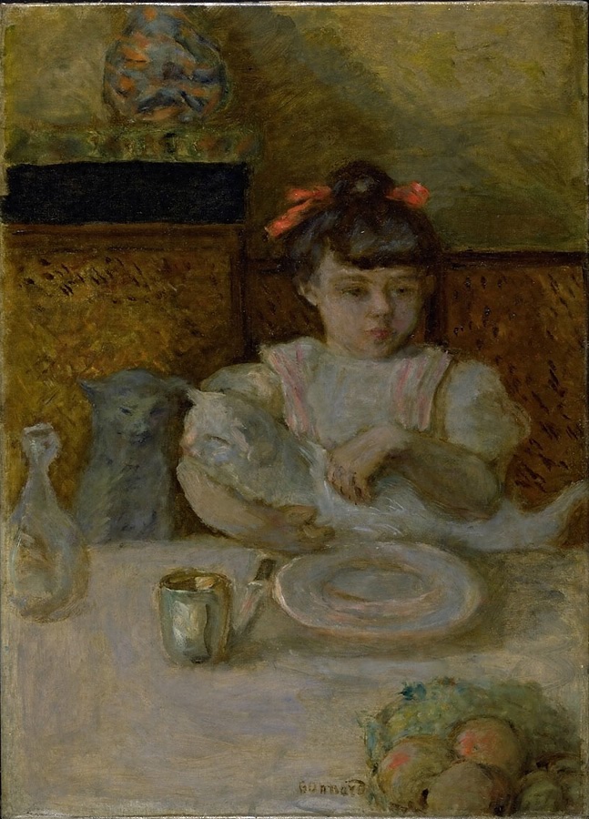 部屋には柔らかな光が射し込み、猫を抱いた少女が食事を待っている。白い食卓と猫と少女がひとつに溶け合い、背後から浮き立ってピラミッド型の安定した構図を形成し、画面を水平に横断する2本の線と少女や食卓に置かれた瓶などが生み出す垂直方向の動きとが相まって、画面にはさらに堅固な骨格が与えられている。やや俯瞰的な画面では、右下の果物が一部切断されて描かれることによって、見るものとの関係がいっそう親密になり、ボナールが浮世絵あたりから学んだスナップショット的な感覚をうかがうことができる。きびきびした筆致で描かれた画面には、豊かなマティエール感が生れ、穏やかな色調の中で、ところどころに配された鮮やかな色彩が画面を小気味よく引き締めている。身近な光景を芸術へと昇華させたアンティミスト(親密派)ボナールの卓越した技量の冴えをうかがうことができる作品である。(Kr.H)