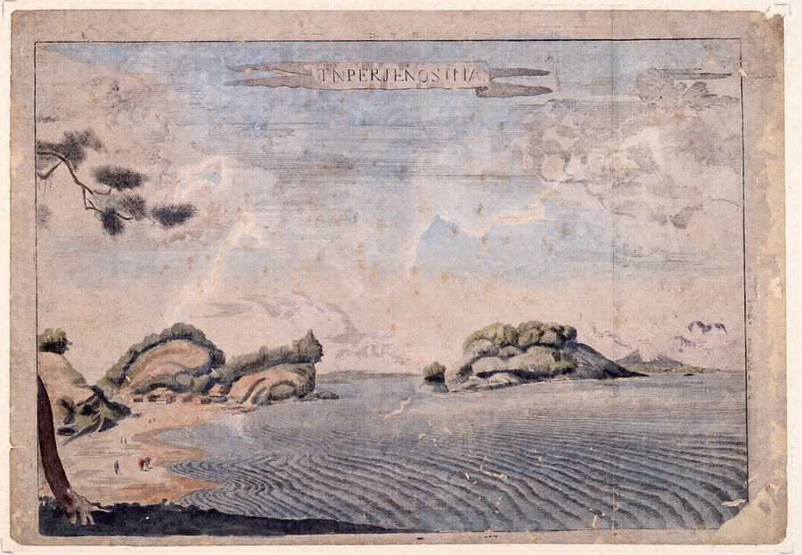 司馬江漢が天明年間(1781-1789)に制作した風景銅版画のひとつ。高い視点から俯瞰する表現をとっています。ここで司馬江漢の関心は富士山よりも、江之島・小動岬(こゆるぎみさき)を奇怪な岩塊として表すこと、池のように静かな太平洋に無数のさざ波を描き、ある種のリズム感を表出しようとしたのかもしれません。寛政年間(1789-1801)の油彩画「相州鎌倉七里浜図」(当館蔵)に見られるようなダイナミックな空間と動感を示すまでには至っていません。