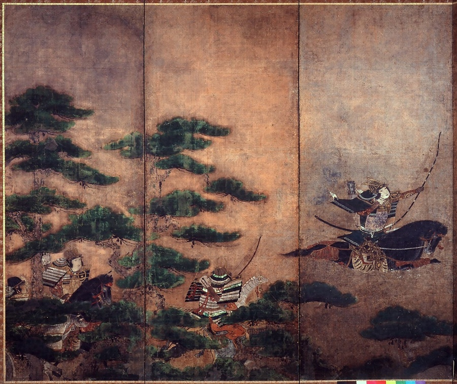 『平家物語』に語られる屋島合戦より、武勇伝を大写しで描く。右隻では平氏の侍大将悪七兵衛景清がその怪力により三穂屋十郎の兜の錣を引きちぎるシーン、左隻では有名な那須与一の扇の的の場面が描かれます。
