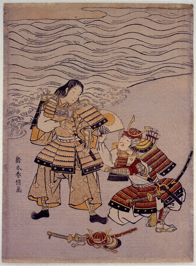 美人画をを得意とした春信が描くと、関東武者の直実と凛々しい美少年敦盛が顔を見合わせる間には、敵味方の関係とは異なる情感がこもっています。