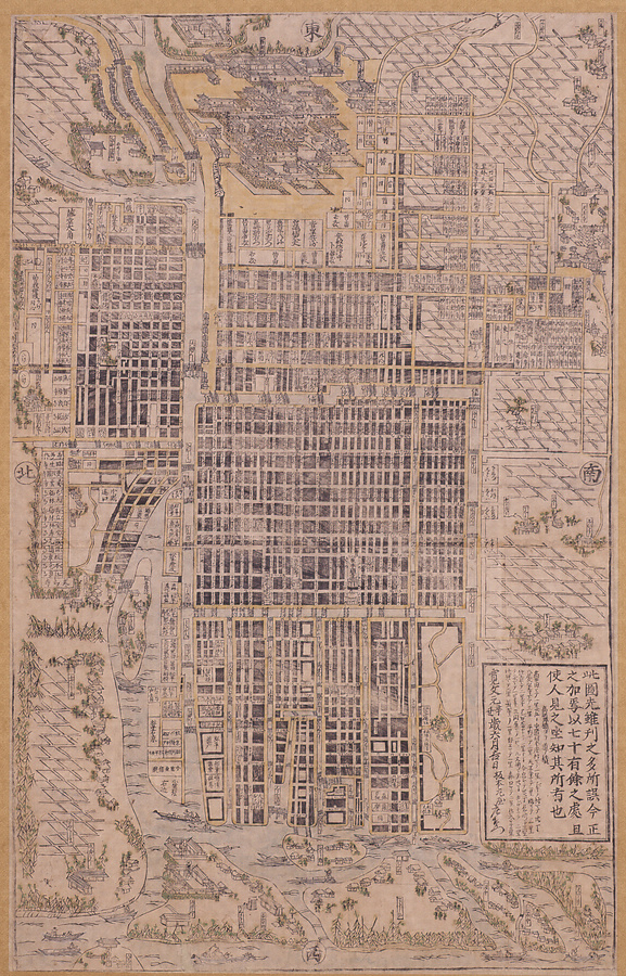 大坂図の刊行は17世紀後半からはじまります。本図はそのなかでも早い時期である寛文元年(1661)に刊行された大坂図です。縦長の紙面の上部に大坂城が、その下部に島之内、船場、堀江などの町屋が続くように配置されています。大坂城周辺の京橋口定番下屋敷や玉造口定番下屋敷、東西町奉行屋敷などに記された在坂役人は古い情報を記載しており、刊記(奥付)に記された「寛文元年辛丑歳六月吉日」と一致しません。本図は印刷図でありながら現存が一点しか確認されていない、稀覯図です。