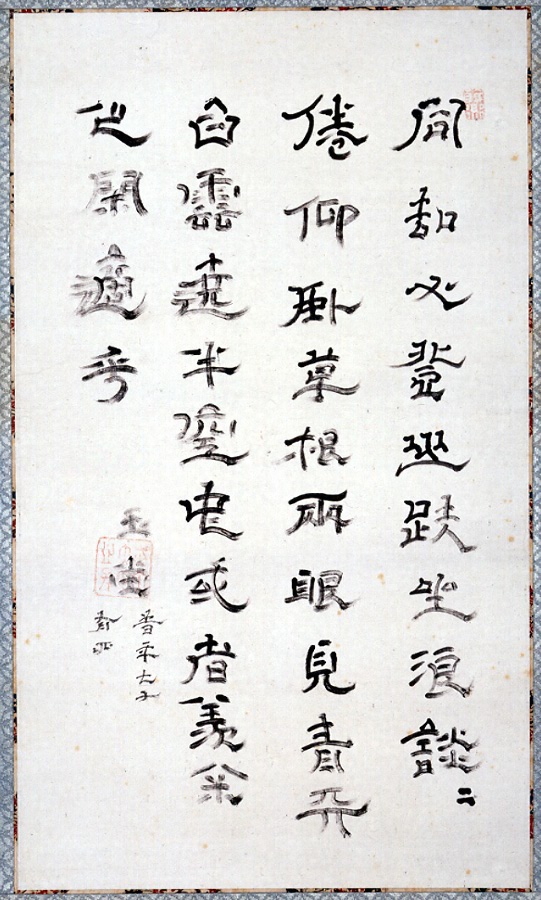 岡山池田の藩士の家に生まれた玉堂は、藩主の政治の理想を継承しつつ、大目付の地位に就くが、文人的生活に耽るあまりその地位を罷免され、その後一切の官職を退いた。五十歳の時二人の息子を連れて出奔し、旅先から脱藩を届け出、以後自由人として各地を旅歴し、漂泊の人となった。脱藩後の漂泊の足跡は、九州から奥羽にまでおよんだ。彼の絵は文化年間より多く生み出されたようで、渇筆と擦筆が混じり合った独特の様式はこの頃完成したと思われる。 「同知心(必)登山趺坐浪談々/ □仰臥草根両眼見青天/ 白雲□半空中或者羨余/ 之閑適乎」「知心とともに(同知必ず)山に上る。趺坐してほしいままに談々。□んで草根に仰臥し、両眼青天を見る。--白雲は空中半ばを遮る。ある者は余の閑適を羨むだろうか」もともと同一紙面にかかれていたもので、本来は三段構成の書画であり、分割されて現状のそれぞれ独立した形式の掛幅四幅となった。この詩書は下段左側に書写されていたもので、山水図(深山渡橋図)は、詩書のとなり、下段右側に描かれていた。