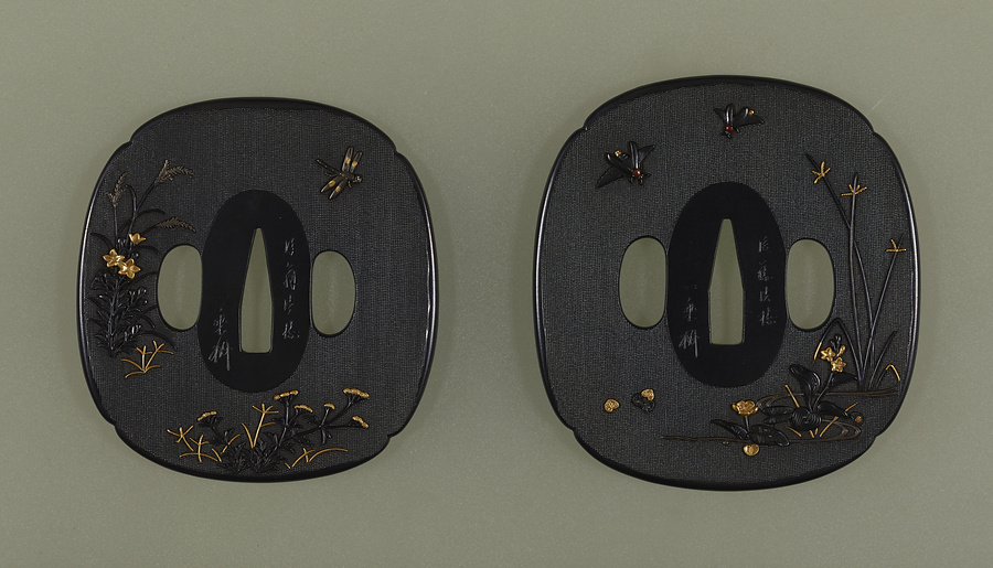 この作品は、打刀と脇指をペアで用いるときの二枚の鐔です。打刀の鐔(大)には春空を舞う蝶と夏夜を飛ぶ蛍、脇指の鐔(小)には秋空を滑空する蜻蛉が見られ、一対の鐔を生かして春から秋の時間が流れています。作者の後藤一乗は、幕末の京都で活躍し、細密な表現を得意とした装剣金工です。