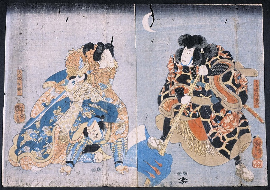 役者絵。毛野と道節が対峙する場面は原作にはない。芝居の脚色場面。