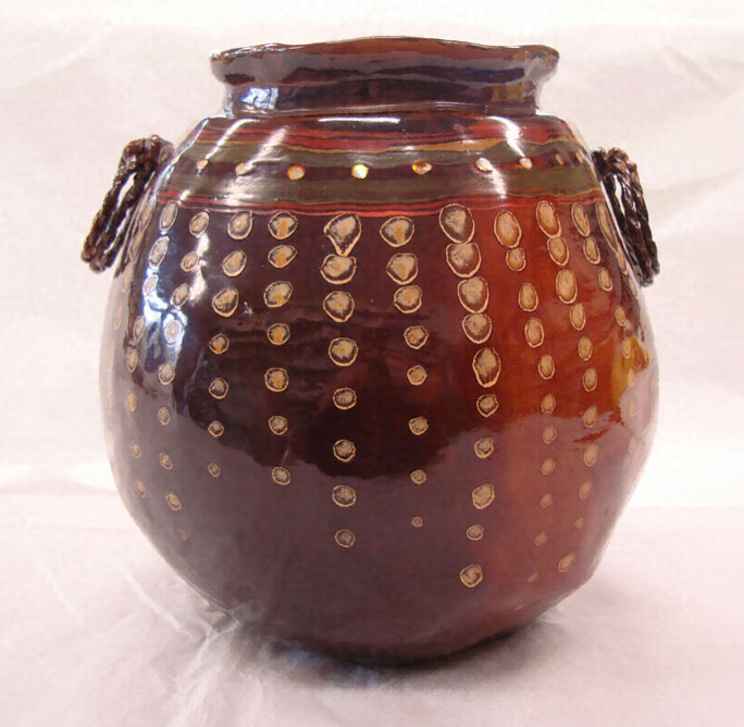 本資料は、高岡ゆかりの漆芸家・木村天紅が製作した乾漆花生である。本資料は胴部に膨らみを持たせてあり、左右両側に紐を捻ったようなデザインで把手が2箇所付いている。表面には彩色が施されており、口縁部の周囲に顔料が廻らされている。また、口縁部から底部にかけて黄色の顔料で丸模様が上下に羅列して描かれている。底部は朱漆で銘が入っており「天紅」とある。