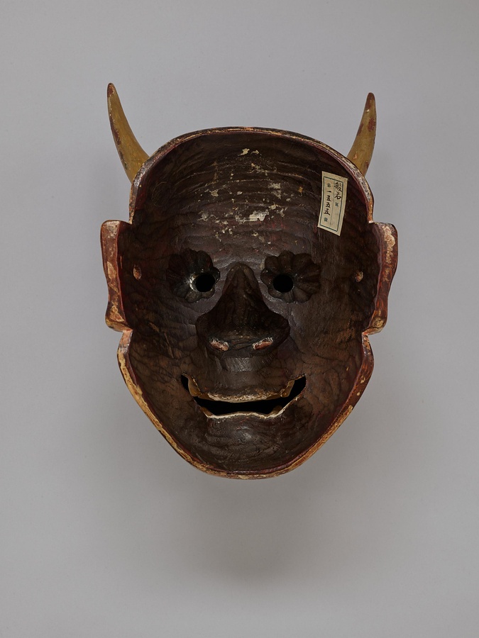 面裏の鼻孔の間に二つの丸刀跡があるのは河内の知らせ鉋(がんな)であり、河内らしい上品な作となっています。目の裏を菊花形に刳(く)る点、凸字形の鼻の刳りなども金春家から細川家に渡った本面(東京・永青文庫所蔵)を写しているのでしょう。哀しみの表現において本面には及びません。