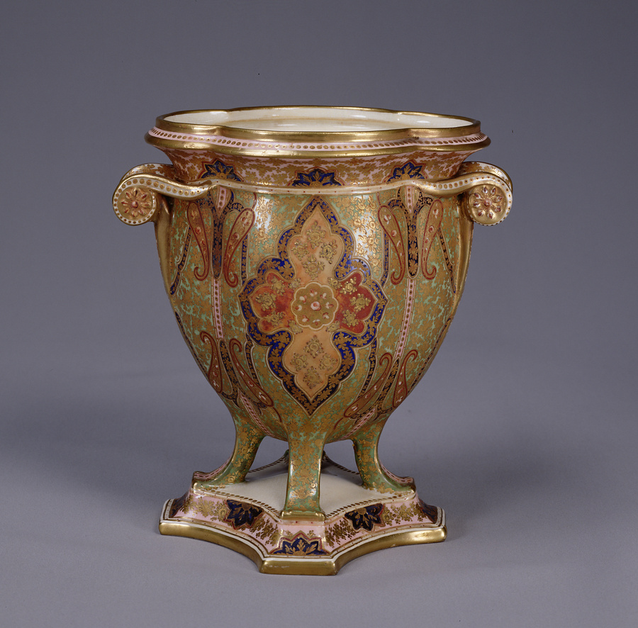 金彩で華やかに飾られた脚付きの深い容器。底部の銘から、イギリスのコールポート窯で焼かれた作品であることが分かる。コールポートは18世紀末に開かれた窯で、マイセンやセーブルの流行を取り入れた磁器の生産で人気を集めた。