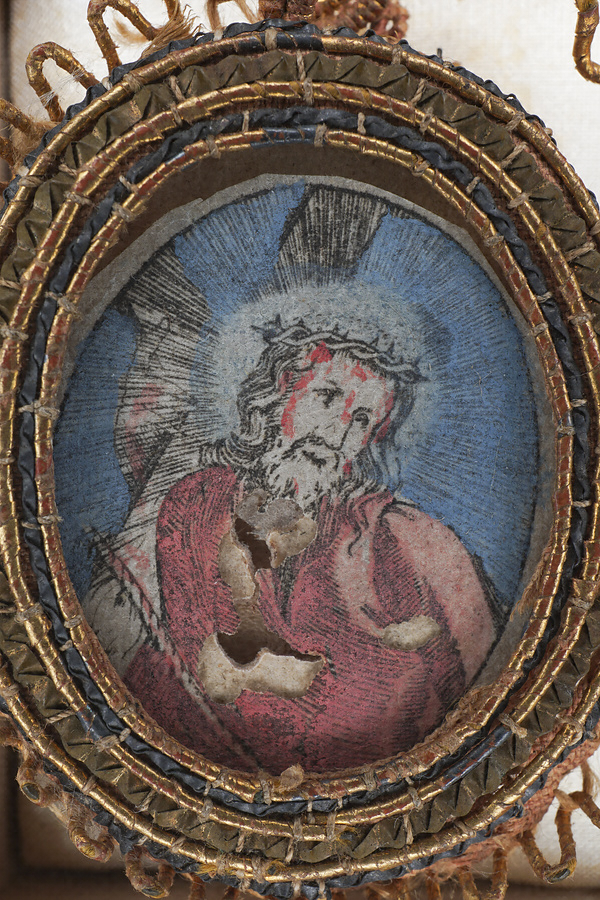 茨の冠をつけられ、自らが架けられることになる十字架を担いでゴルゴダの丘に向かうイエス・キリストを描いています。西洋製銅版画に彩色が施され、本来はガラスもはめ込んで聖牌に仕立てられていました。