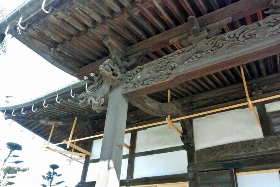市西部の五色台西麓にある真宗寺院。本堂は南正面の入母屋造本瓦葺、向拝一間付。内部を円柱、側廻りを角柱とし、向拝は木鼻に龍や獏を彫刻し、虹梁には波に鯉の躍動的な文様をあしらうなど装飾豊かに仕上げる。讃岐地方の江戸後期真宗本堂の好例を示す。