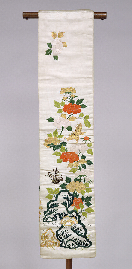 白繻子地岩牡丹蝶模様帯