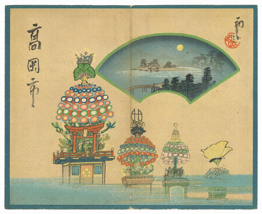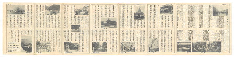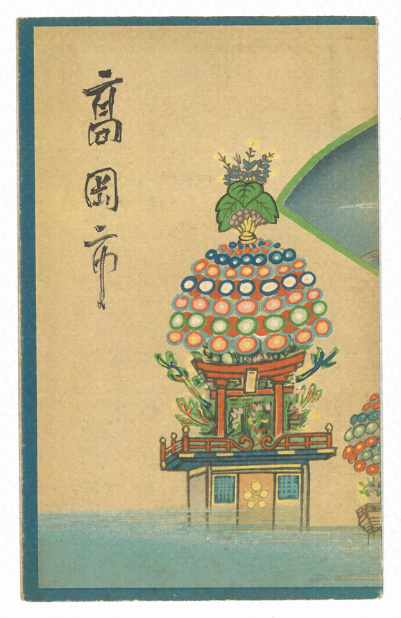 京都出身の鳥瞰図作家・吉田初三郎(1884~1955)原画の高岡市鳥瞰図のリーフレット(原画は昭和7年・当館蔵)。原題は「高岡市を中心とせる名所鳥瞰図」。リーフレット裏面には、高岡市の概要や観光名所、富山県内の名所なども掲載されている。