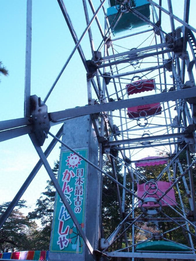 函館公園こどものくににある観覧車。二本の支柱間に直径八メートルのホイールを取り付け、その外周に八台のゴンドラを吊り下げる。ホイールは二本背合せの山形鋼を放射状に配し、外周と中間二か所を山形鋼で八角形に繋ぐ。国内現存最古の観覧車として希少。